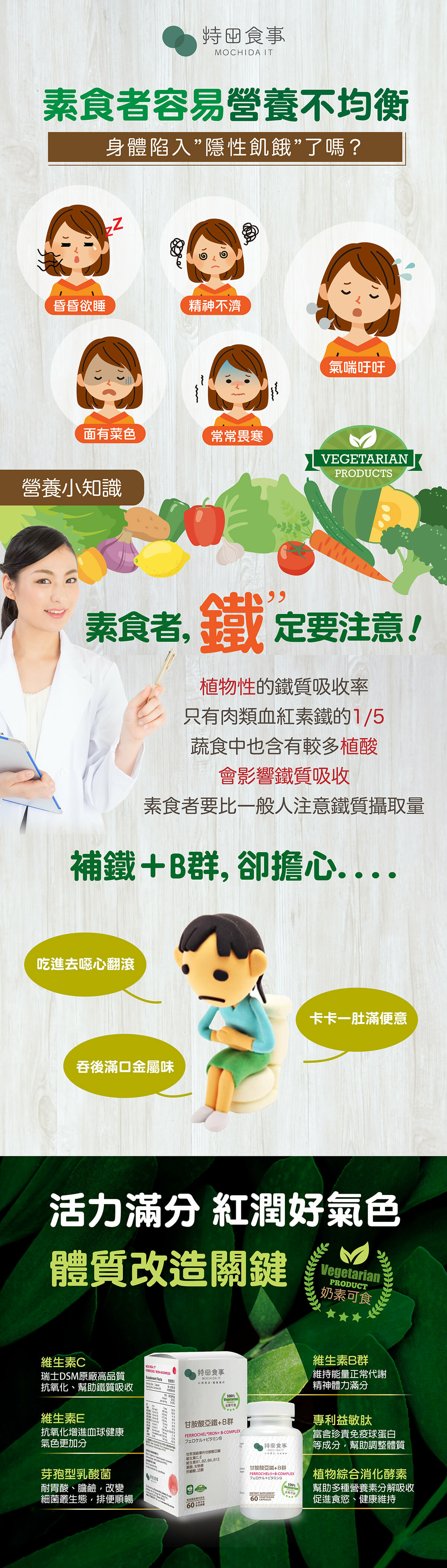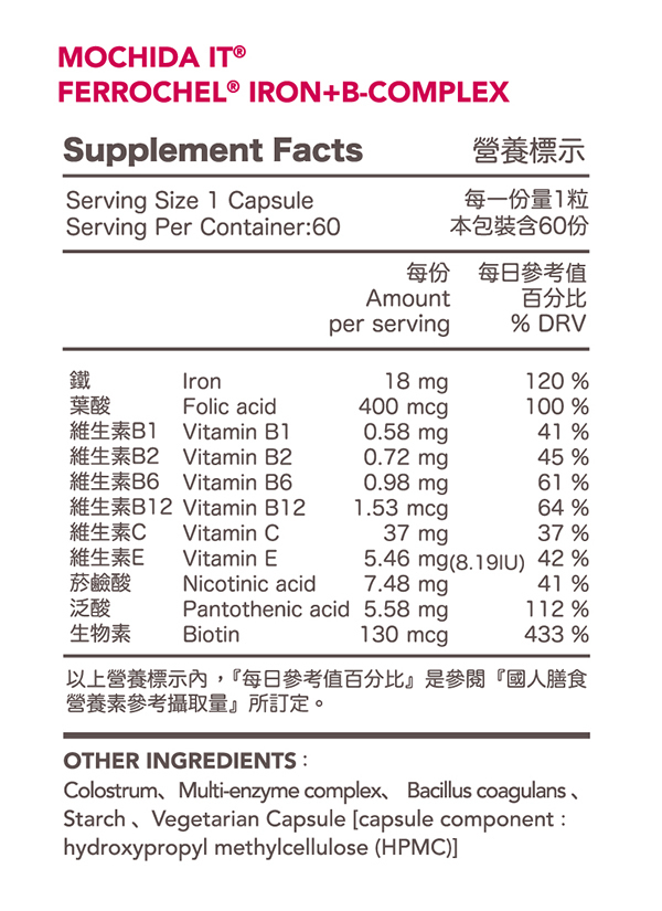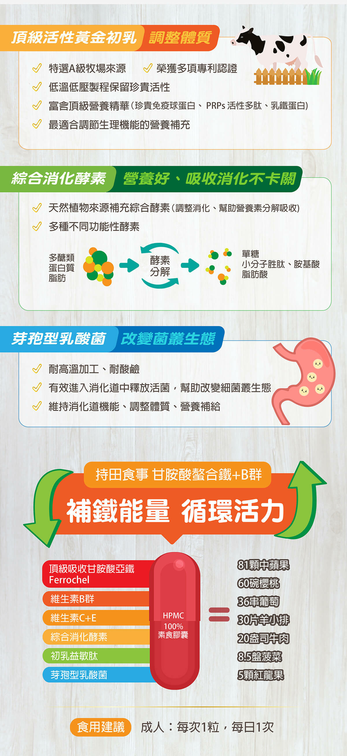 主要原料:甘胺酸亞鐵、維生素C、植物綜合消化酵素、益敏肽(牛初乳)、菸鹼酸、泛酸、維生素E、