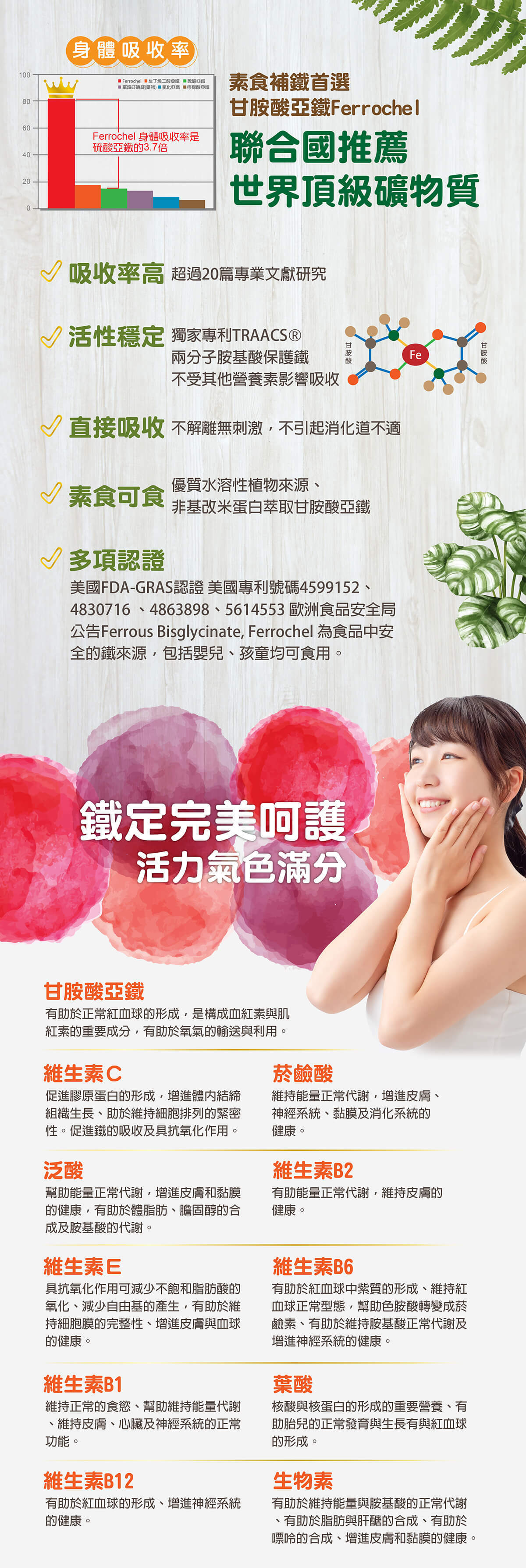 Ferrochel®甘胺酸亞鐵為聯合國推薦的專利鐵,吸收率高,活性穩定,擁有超過20篇專業文獻研究。獨家專利TRAACS®兩分子胺基酸保護鐵不受其他營養素影響降低吸收。通過美國食品FDA-GRAS安全檢測,擁有多項美國專利,專利號碼:4599152, 4830716, 483898, 5614553。