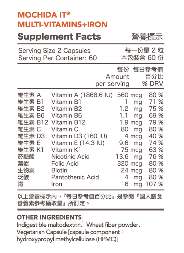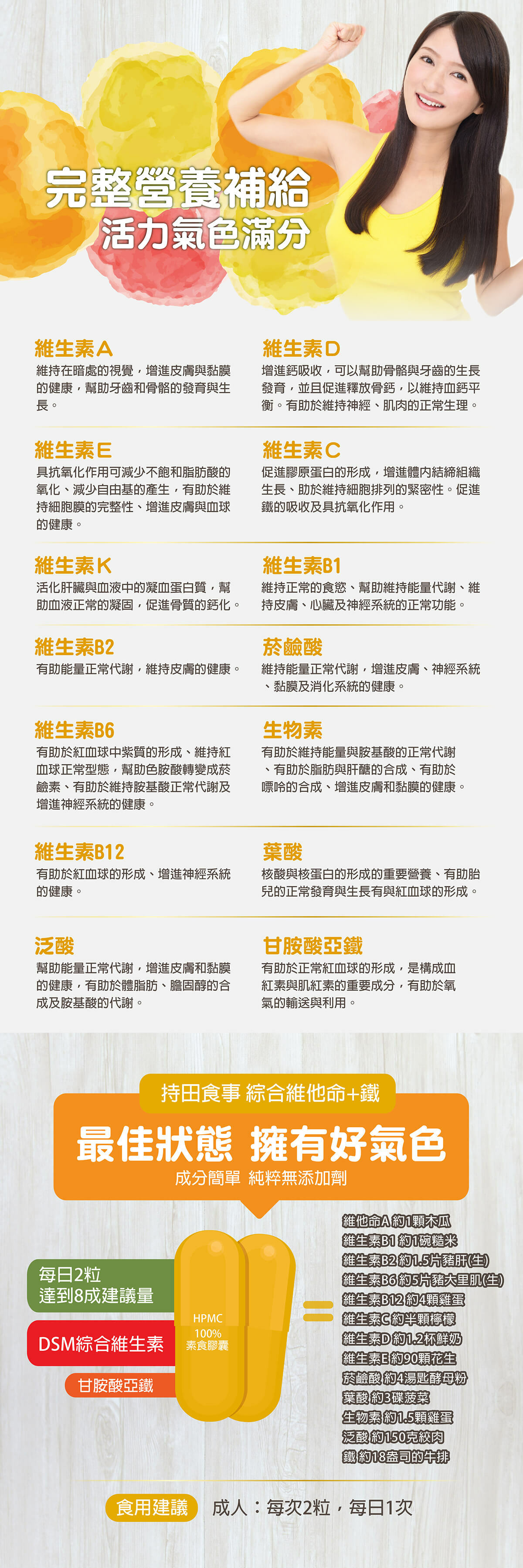 維生素K1、菸鹼素、葉酸、生物素、泛酸)、甘胺酸亞鐵