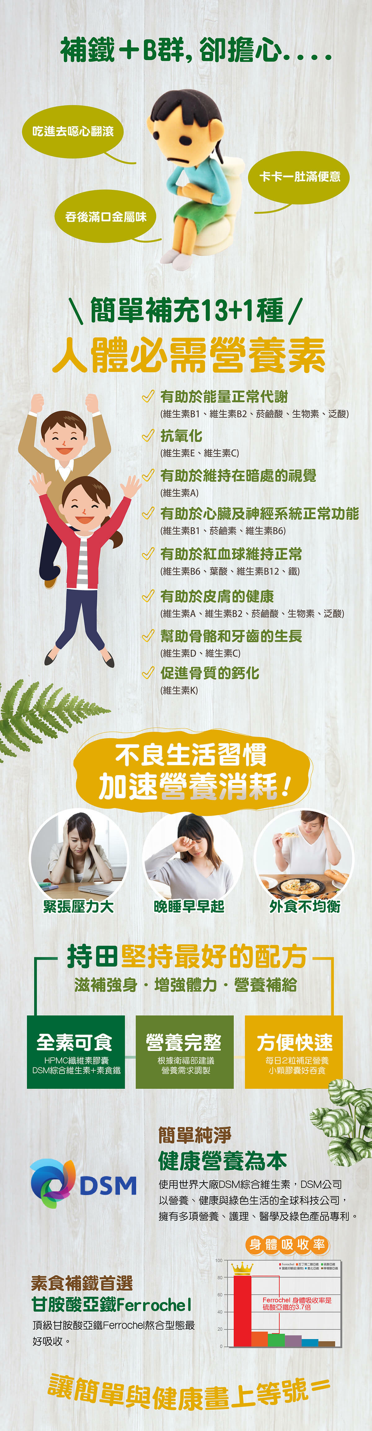 持田食事綜合維他命錠+鐵,提供素食者完整的營養需求,
